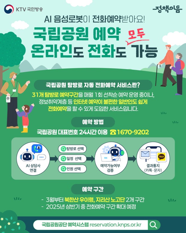이번 서비스는 인터넷이나 앱을 통한 예약에 어려움을 겪는 정보취약계층 탐방객들이 국립공원 탐방로 예약을 보다 효율적으로 할 수 있도록 전화로 쉽고 간단하게 예약을 도와준다.