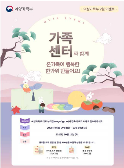 한편, 여성가족부 대표 누리집(www.mogef.go.kr)에서는 추석을 계기로 ‘가족센터 초성 퀴즈’ 행사(9.29.~10.10.)를 진행한다.