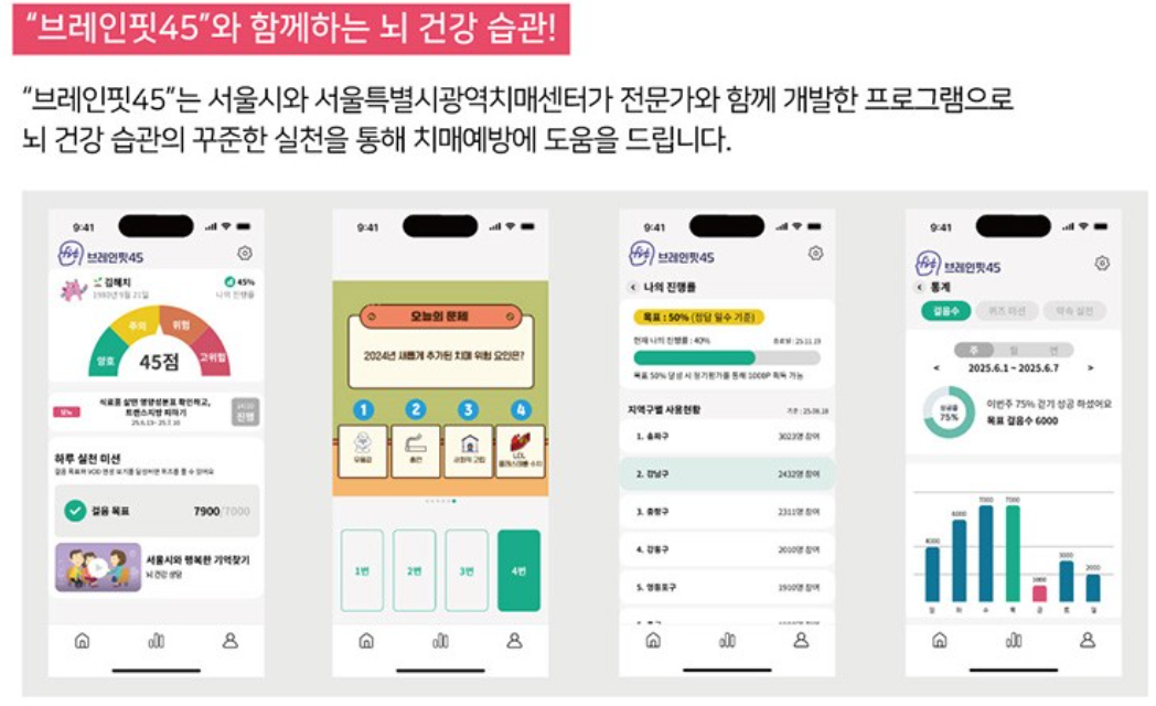한편 서울시는 중장년기부터 치매를 예방할 수 있는 앱 ‘브레인핏 45’을 손목닥터9988과 연계해 지난달 정식 출시했다. ‘브레인핏45’는 만 45세 이상 시민 누구나 참여할 수 있으며 ▴치매위험도 자가 점검▴뇌 건강을 위한 맞춤형 처방 ▴하루 5분 치매예방 및 건강 정보형 퀴즈 등 다양한 기능을 제공하고 있다.